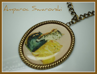 Cadena larga en bronce con medallón de distintos modelos de gatitos. Medidas del medallón: 37x50 mm.Artículos y Opiniones de Joyería Artesanal Amparoc